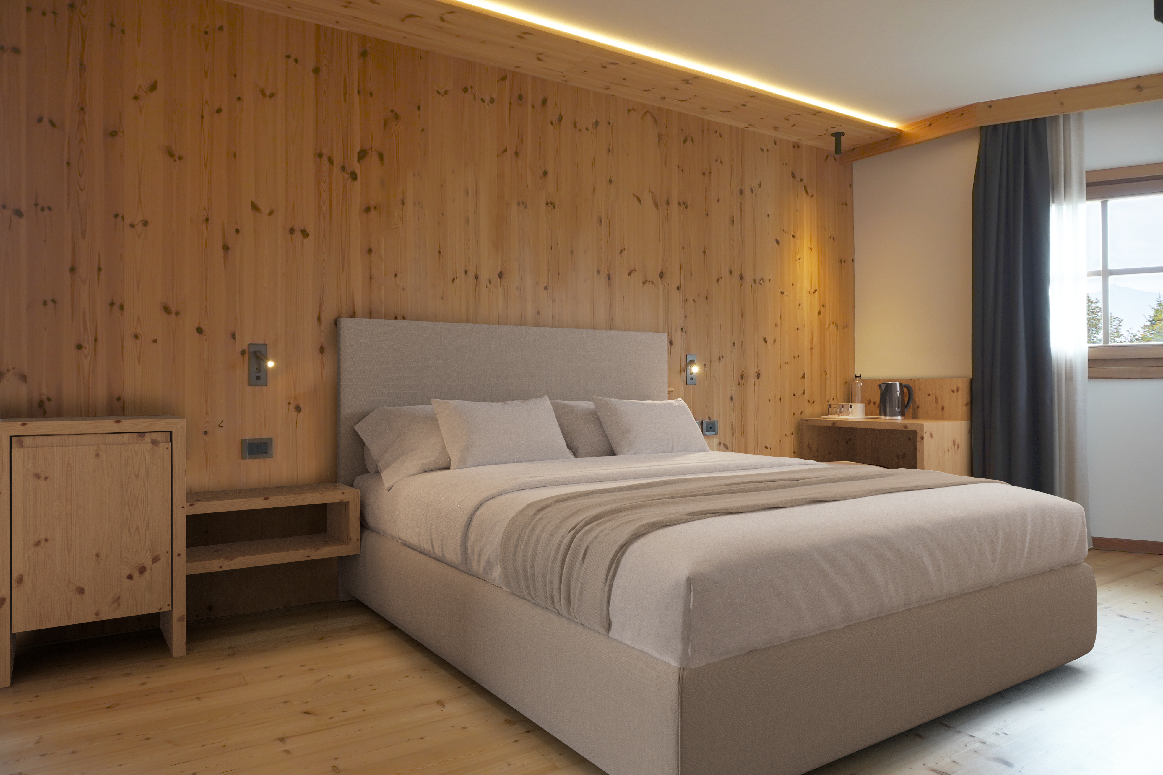 Zimmer von ca. 22 m² mit einem Kingsize-Bett, privatem Balkon mit Panoramablick auf unsere Berge oder das Tal. Lärchenboden und Möbel aus natürlichem Fichtenholz. Fensterbad mit begehbarer Dusche und Haartrockner. Satelliten-TV, WLAN, Wasserkocher mit Auswahl an Tee und Kräutertees, Safe und Kühlschrank. Möglichkeit zur Hinzufügung eines dritten Bettes. Unverbindliche Darstellung.